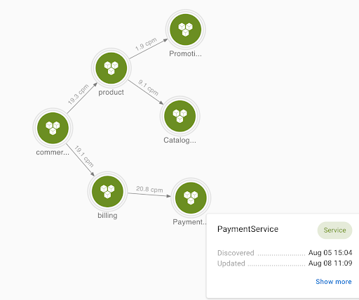 Asserts’ entity discovery process can help here. Because a few simple rules specify the process, we can be flexible in how we interpret the system. We could treat commerce as a single entity and associate all the metrics to it, or as a better alternative, we can break it down into three layers of services. By changing a few lines, we can easily extract labels that identify the three layers, i.e., gateway, api, and service, and use them to construct a service graph.