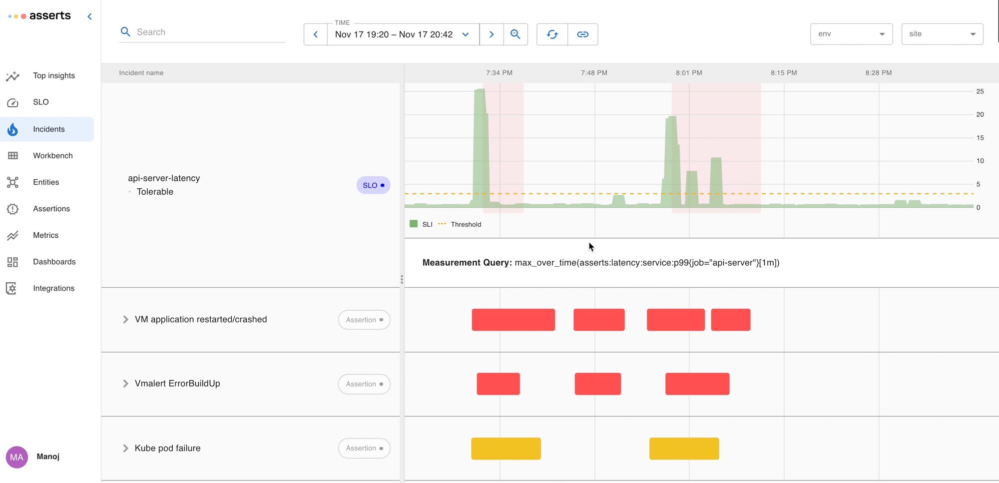 Asserts makes it super easy and fast to get to the bottom of app and infra problems -- even for highly scaled and complex architectures. You’ll get alerts for the key metrics your users care about the most. You’ll know right away when something important breaks and you won’t waste time sorting through less relevant or false alarms.
