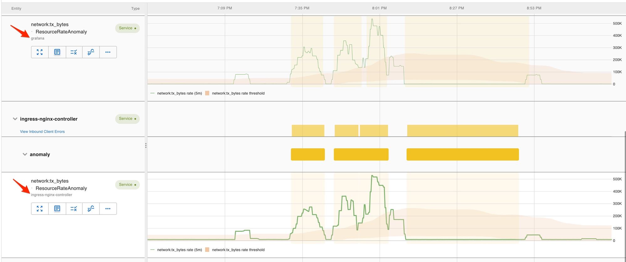 The Assertions surfaced anomalous network usage during this time: there was an unusual amount of traffic between Grafana and our ingress controller that routes traffic from our browser frontend to the backend services. This was positive evidence that someone must have been evaluating particularly heavy queries via grafana query interface.
