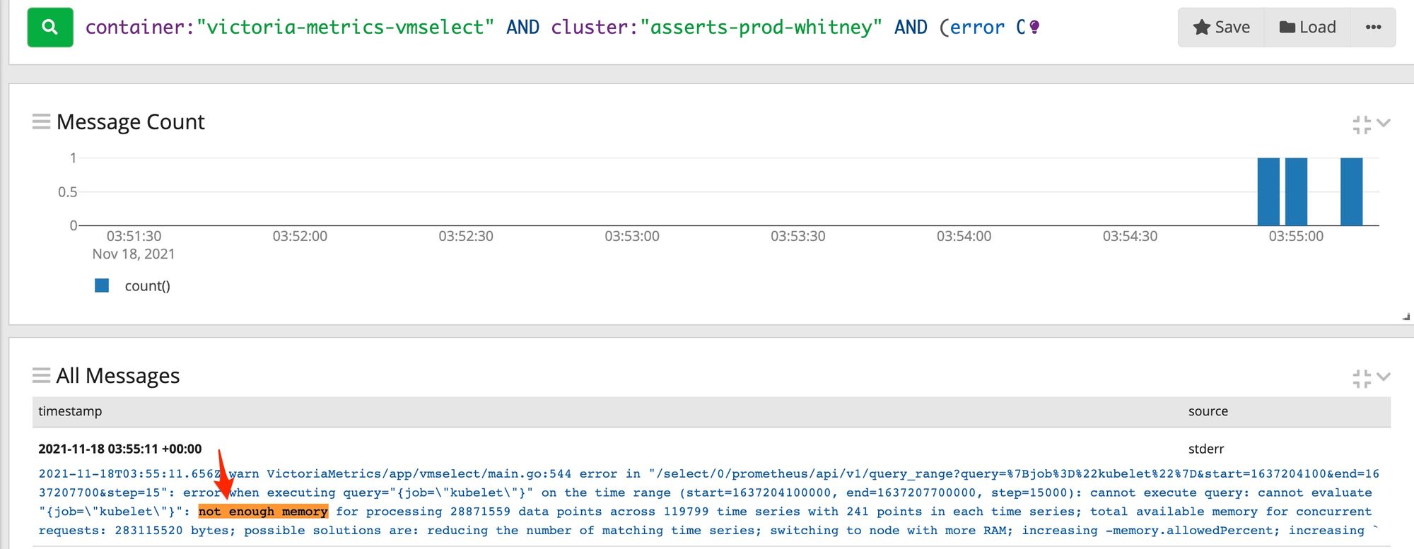 A glance at the logs launched from View Logs showed an error: vmselect ran out of memory while executing a query.