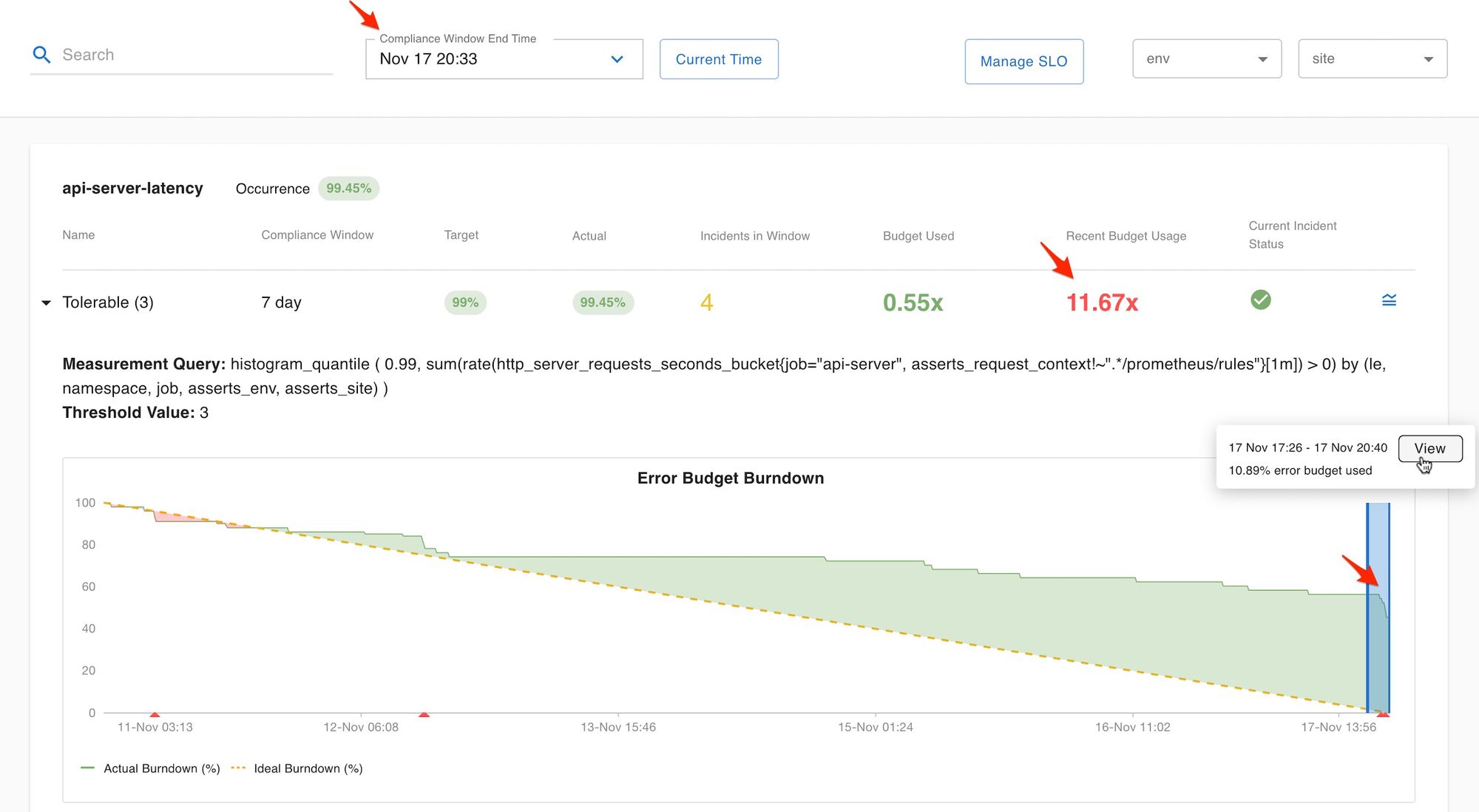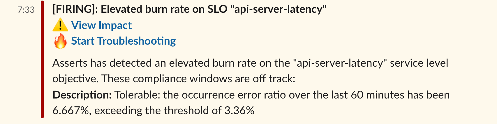 To monitor our app, we’ve set up service level objectives to track its performance. We realized something was wrong when Asserts sent us an alert pointing out that our API-server latency was slow and our ability to evaluate recording rules for our customers was degraded.