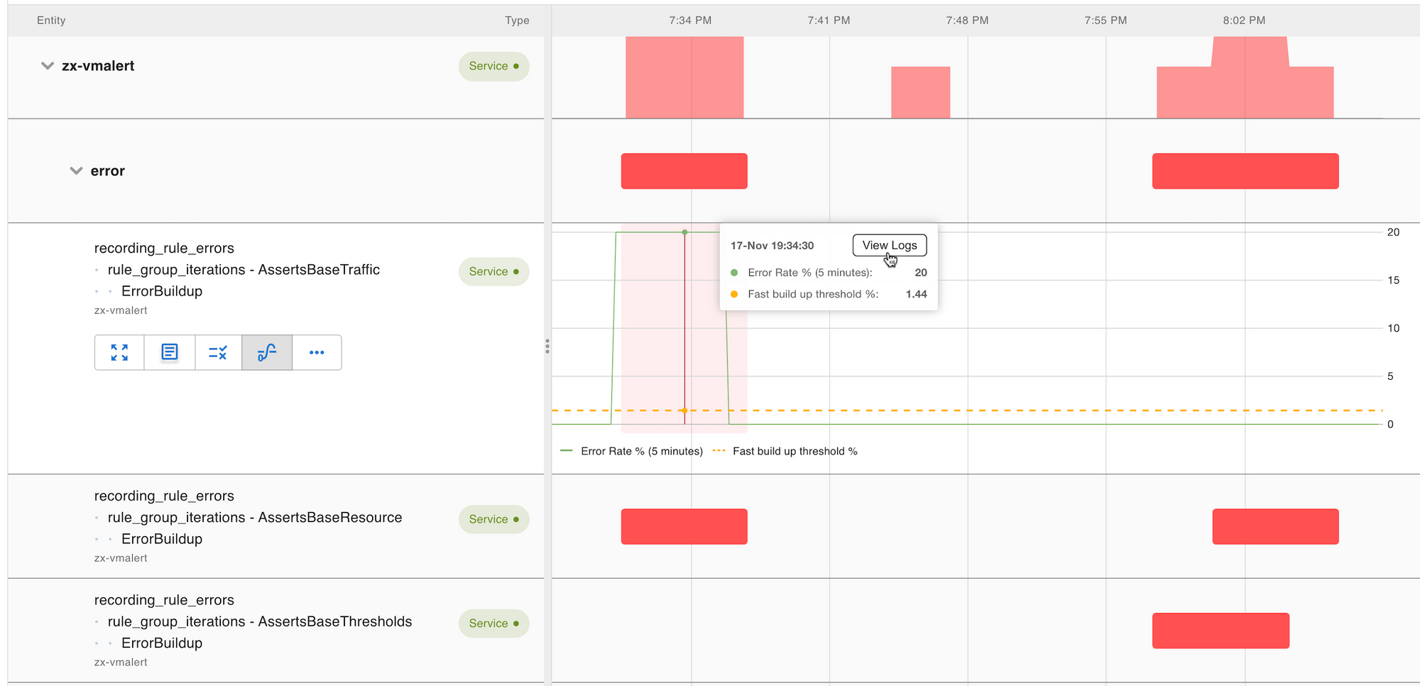 Drilling into assertions from other services, we also noticed that during the outage a number of our vmalert instances were throwing errors. This means rule evaluations failed while the query layer of the time-series database, vmselectwas down. Since we run separate vmalert instances for each customer, we knew which customers and rule groups had been impacted and which had not. (Note the customer names are redacted in these screenshots).