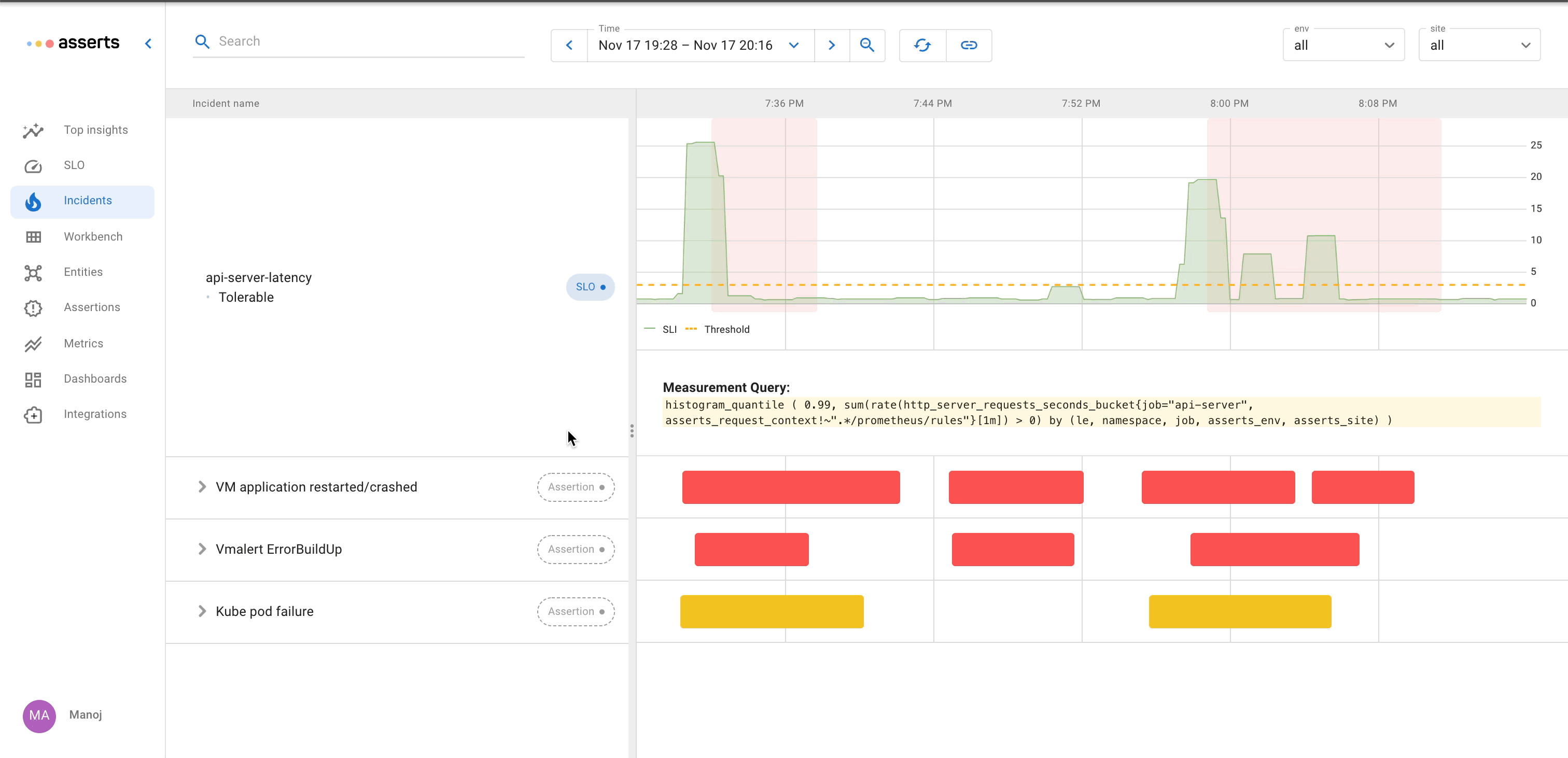 The troubleshooting process often involves looking at a few different entities and signals together to deduce causality from correlation. Asserts has made this task very easy with a Workbench feature. To troubleshoot an incident, you can directly add it to the Workbench.