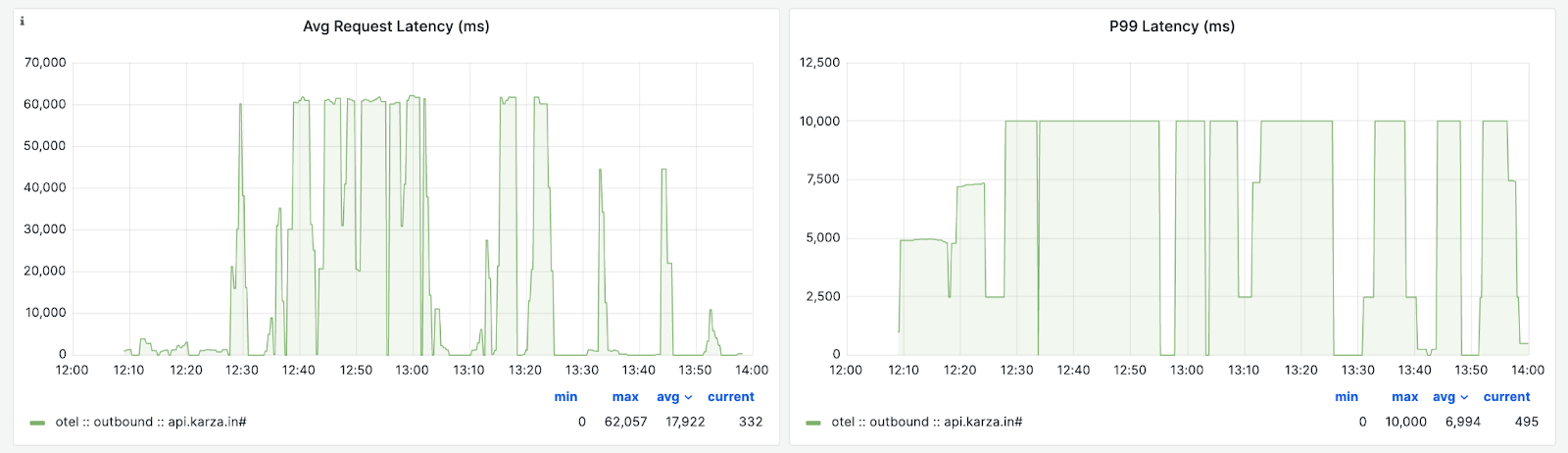 The default buckets don’t sufficiently capture the distribution of the latencies in this case. As explained in an earlier blog post, the fix for this is to add more buckets above 10 seconds to the histogram. OpenTelemetry has a newer exponential bucket histogram metric, which could have addressed this, but we couldn't use it as the metrics are exported using a Prometheus exporter, and that doesn't support the exponential bucket histogram yet—more about this later in the blog.