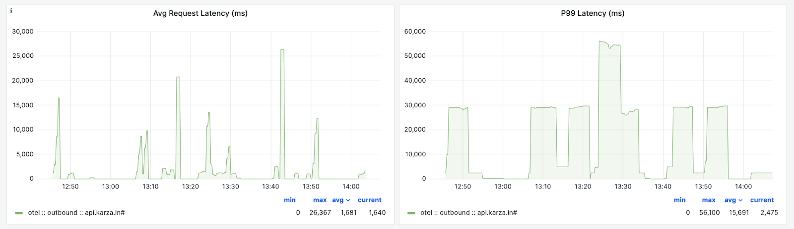 Asserts uses a Prometheus-compatible time series database. Recently a customer of ours ran into an issue that required customizing the buckets. This customer is in the fintech domain, and a service of theirs integrates with a number of external APIs of other financial institutions. These APIs, at times, take well beyond 10 seconds. What we noticed in the Asserts KPI dashboard is that while the average latency is well beyond 30 seconds, the P99 reported is maxed at 10 seconds, which was incorrect: