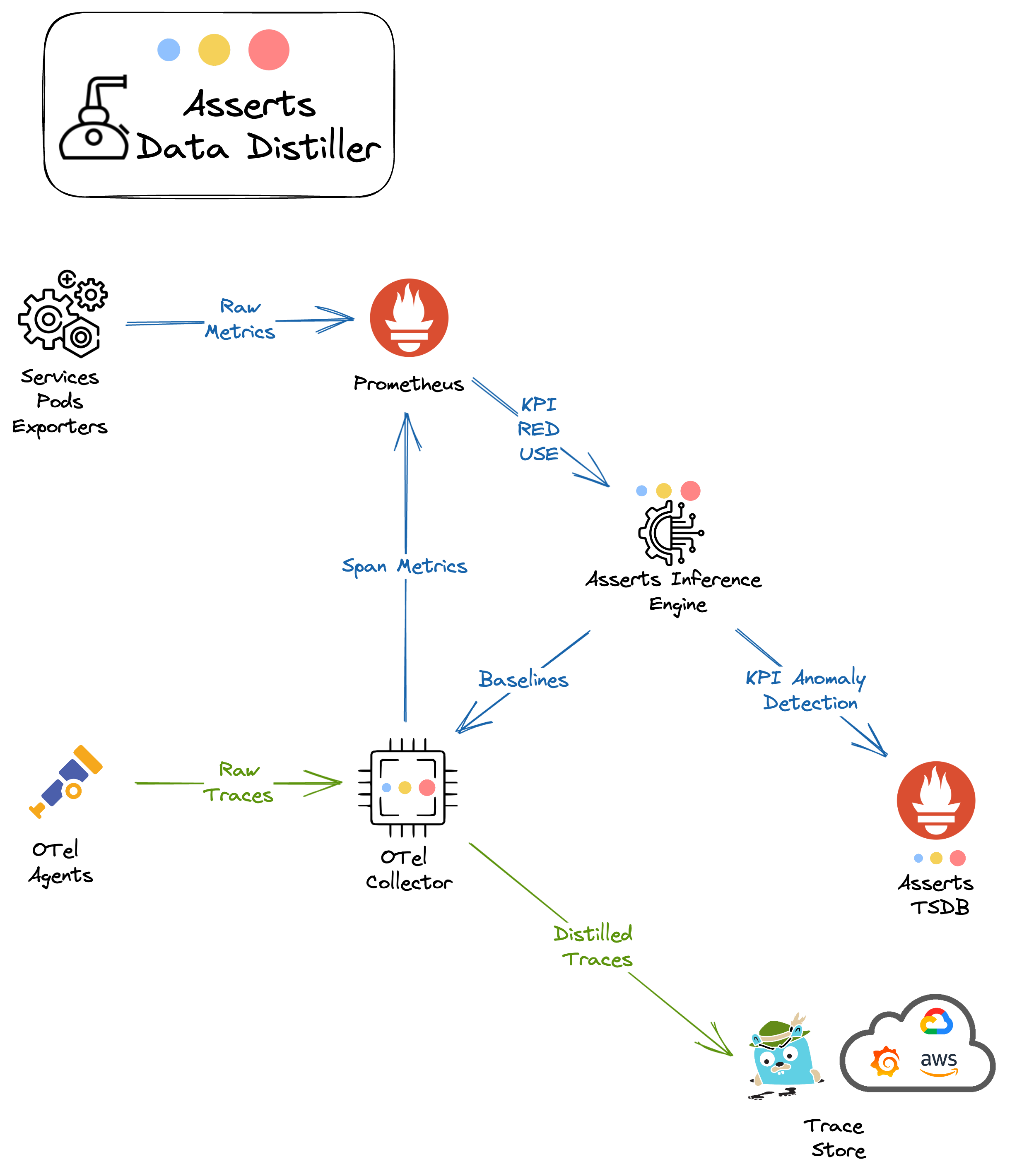 Asserts Data Distiller™ automates data efficiency for your observability data. The Prometheus exporters and client libraries capture a richer set of metrics than their commercial equivalents, ensuring maximum visibility. Asserts Data Distiller™ queries the short term metric store(s), normalises the metric data, calculates baselines and persists it in its own Prometheus compatible long term metric store. The normalised long term data is 10 - 20 times smaller in storage and compute requirements than the high cardinality metric data making it cost effective for long term reporting.