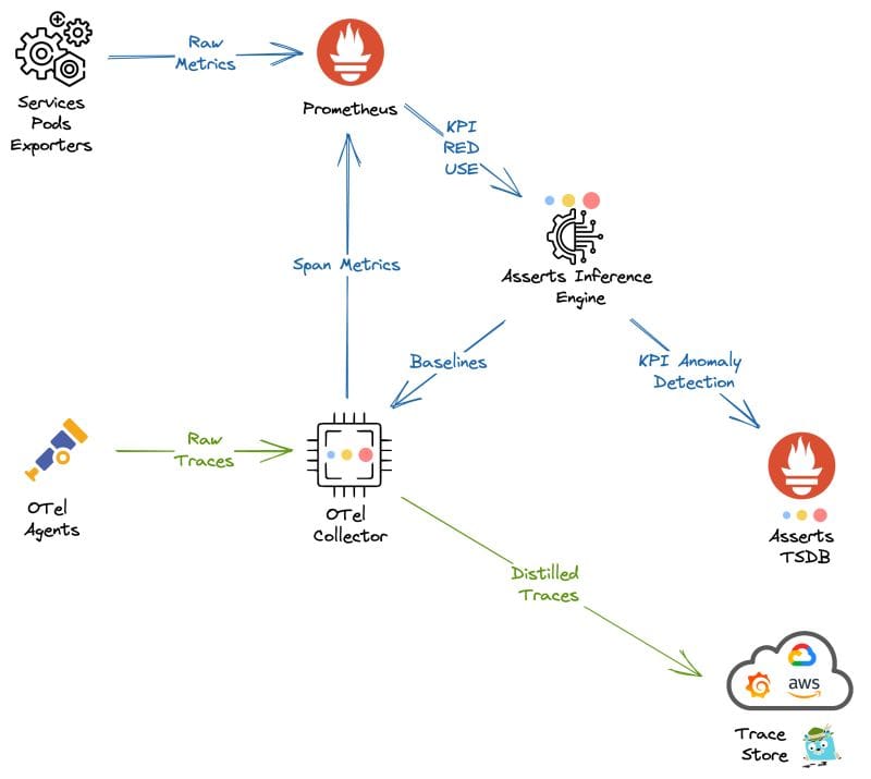 Asserts Data Distiller™ uses the best of both approaches for trace data. It is a processor that plugs into the Open Telemetry collector. All received spans are processed and directly converted into RED and relationship metrics which go directly into the high resolution metric data store. This information is used by Asserts to generate baselines and the Entity Graph. The calculated baseline information is queried by the distiller from the Asserts data store and used to determine if a trace is slow. Only slow traces, those with the error flag set and periodic traces are forwarded to the tracing store e.g. Jaeger. This intelligent approach to trace sampling considerably reduces trace processing and storage requirements while guaranteeing that important information is not dropped.